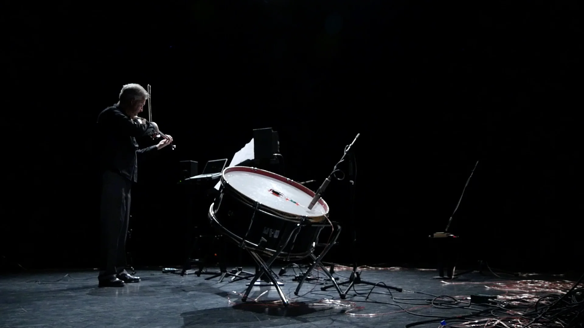 The piano music is sent via transducers to the skins and working parts of various instruments placed around the stage and made to buzz, rattle and shake. The four instruments for this piece are a bass drum, a snare drum, a hi-hat and a zither. This sets in motion a chain reaction of music events whereby each sound is in turn developed further away from the original source. The final stage is through electronic manipulation.